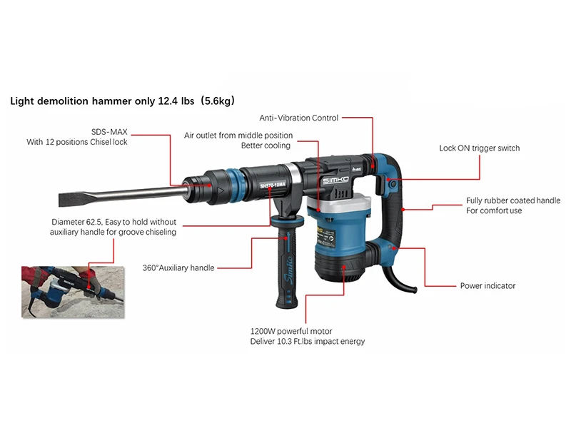 ● 凿子可12档位调节,适用于不同角度的工作环境。