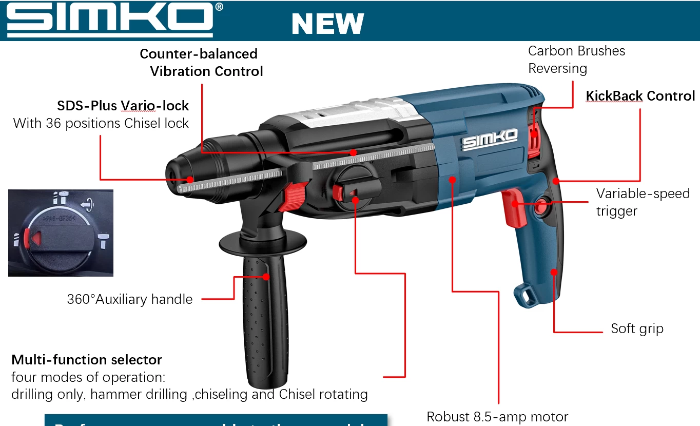 ● SDS-plus® 快换夹头 – 免工具更换钻头,自动锁定,安全便捷。