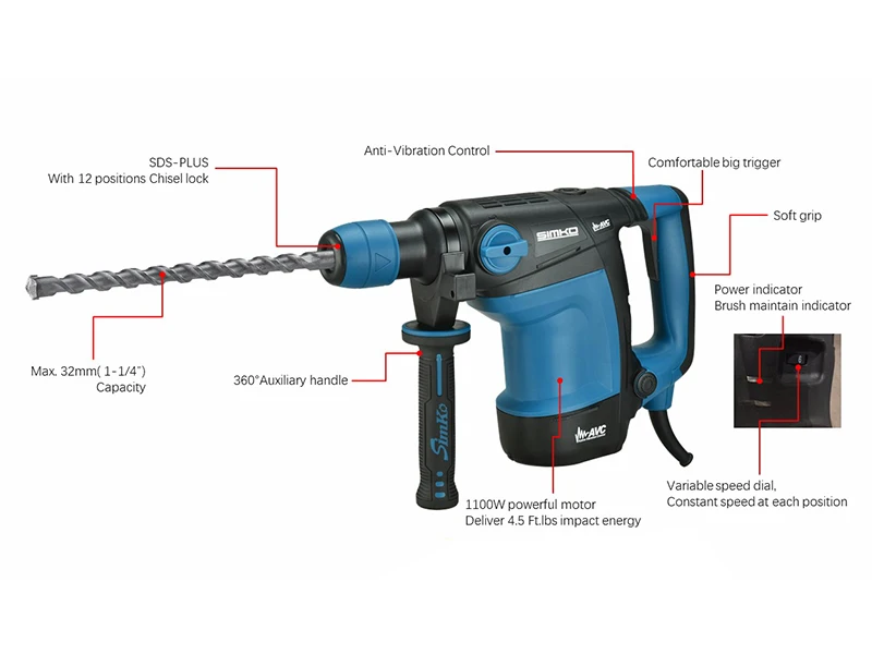 ● 凿子可12档位调节,适用于不同角度的工作环境。